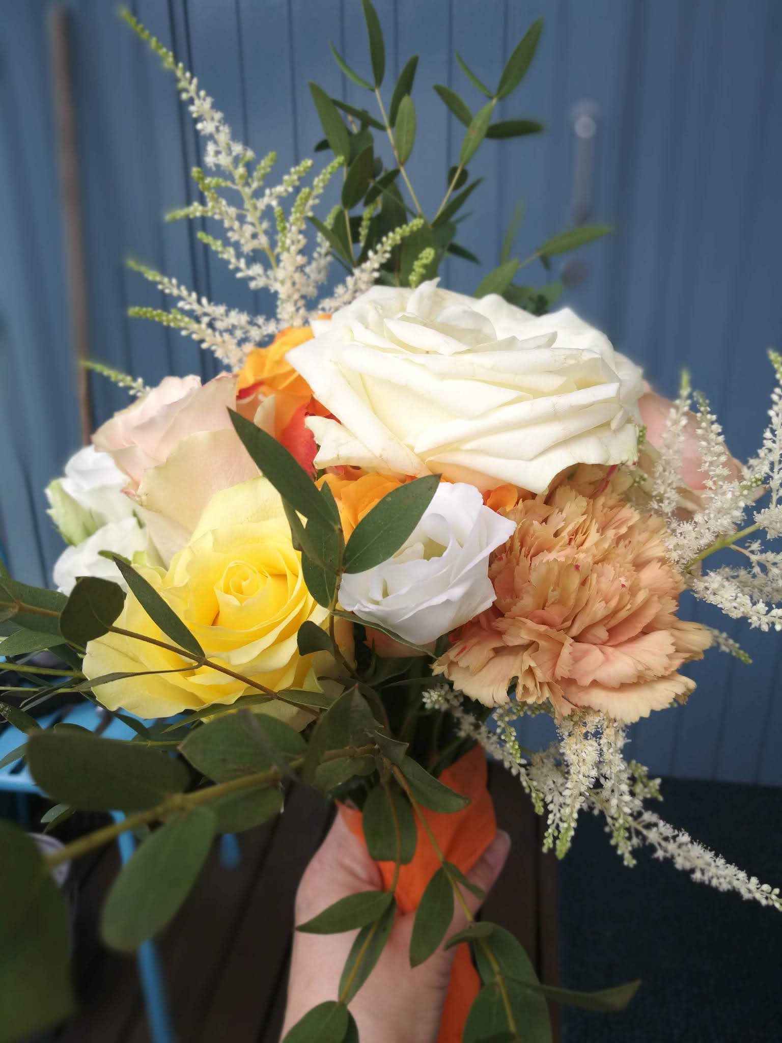 Valkoista isoa neilikkaa, kartionmallista valkoista "patukkaa", valkoista eustomaa värikkäiden oman pihan kukkien lisäksi.