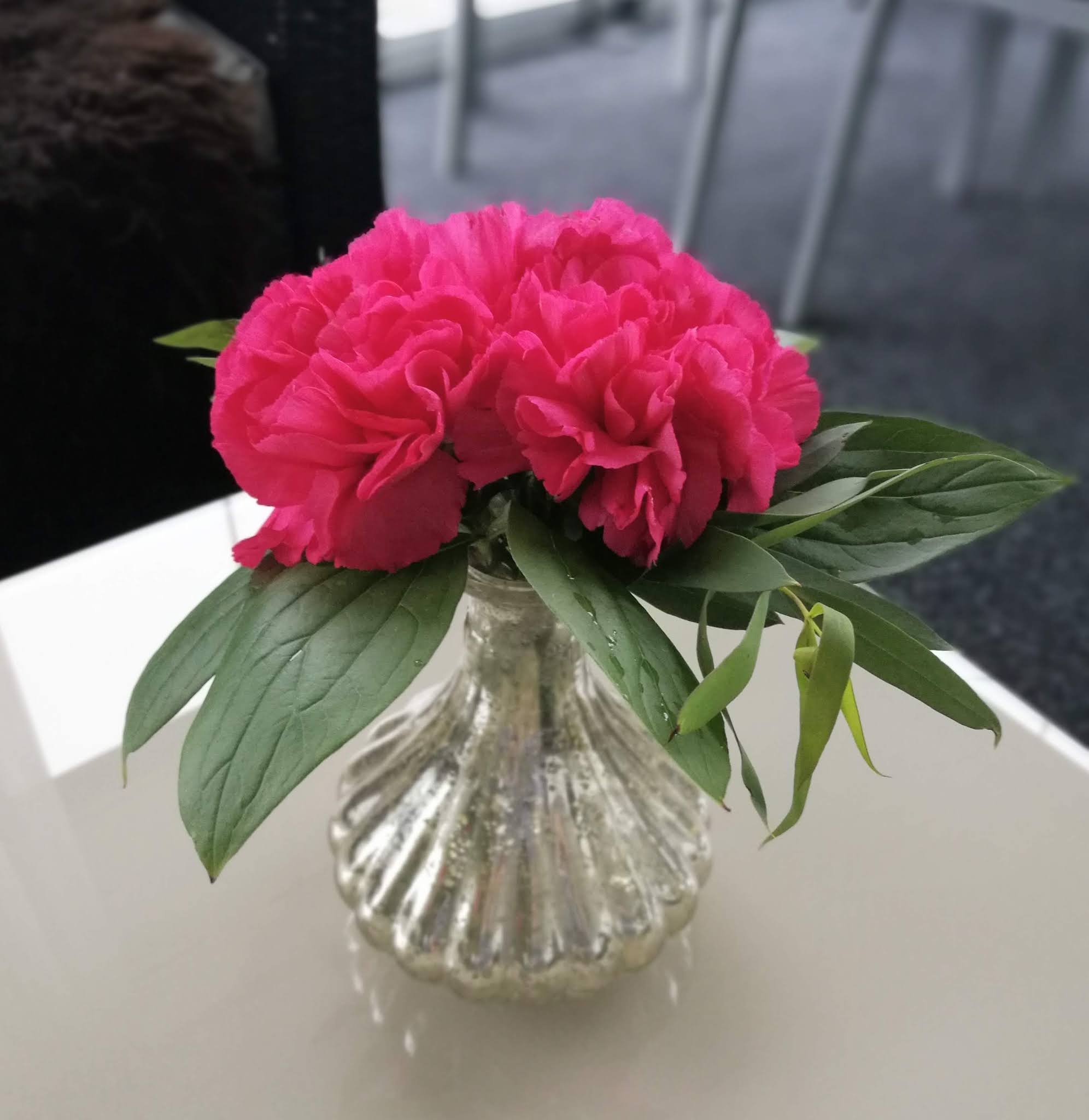 Mutta ei tässä vielä kaikki, mitä lahjakukista sain aikaiseksi. Harjoitellessani kimppujen tekoa, minulla muun muassa katkesi lyhyemmäksi kolme isoa ihanaa vadelmanpunaista neilikkaa (!), joista tein sitten pieneen maljakkoon oman sommitelman.